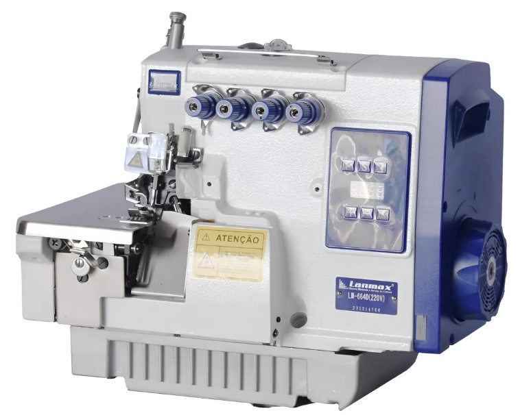 Overloque de 2 agulhas e 4 linhas (Ponto Cadeia) direct drive, control box e painel de comando embutido.