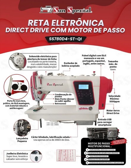 A Sun Special SS780D4-ST-QI é uma máquina reta eletrônica projetada para oferecer precisão, alta performance e praticidade no dia a dia de costura. Equipada com motor de passo e sistema Direct Drive, garante economia de energia, baixo ruído e maior durabilidade.